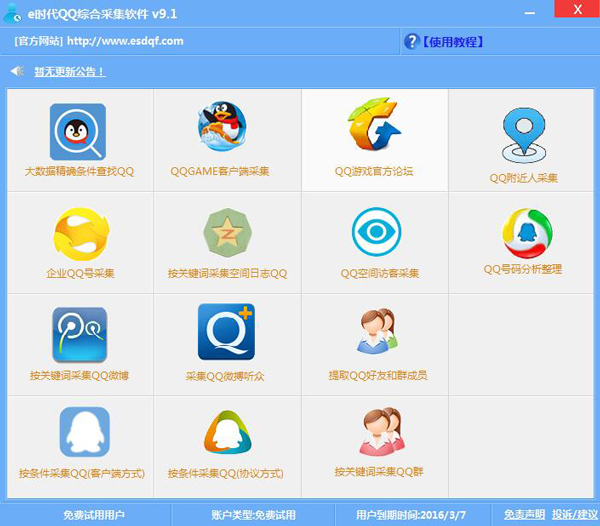 e时代QQ综合采集软件,一款综合的QQ信息采集软件,支持精确条件查找QQ、QQGame客户端采集、QQ空间采集、QQ论坛采集、QQ群采集、QQ空间访客采集、QQ群号码采集、按关键词采集空间日志QQ、QQ客户端采集、QQ拍拍采集等众多信息,采集速度快、精确度高、资源广,是您做营销、找意向客户的必备工具!